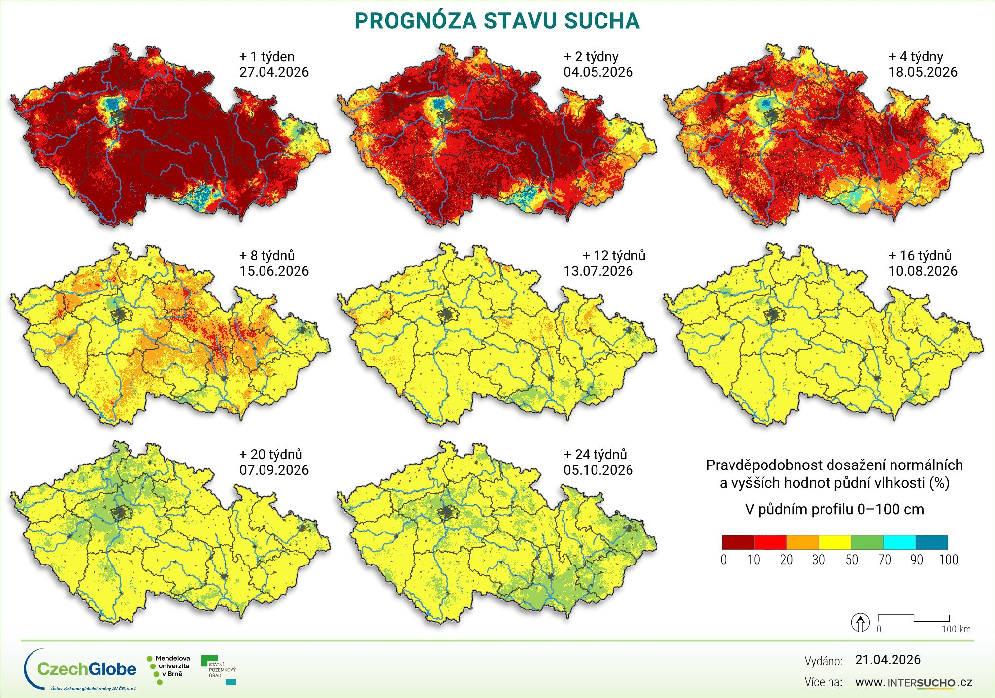 V tomto týdnu (od 27. 4. 2026) bude území Česka hlavně pod vlivem tlakové výše nad Severním mořem, která se začne přesouvat více do střední Evropy. S ohledem na to bude na naše území proudit spíše chladnější vzduch od severu. Bohužel modely tento týden neočekávají žádné srážky. Teploty budou do čtvrtka relativně nižší. Nejchladnějšími dny by měly být středa a čtvrtek s maximy okolo 10–15 °C. Poté se začne oteplovat. O víkendu se mohou teploty vyšplhat i přes 20 °C. Noční teploty se budou často pohybovat mezi 3–6 °C. Ve čtvrtek ráno však mohou klesnout pod bod mrazu. Vzhledem k tomu, že by tento týden nemělo pršet, očekává se, že se půdní sucho bude výrazně rozšiřovat. Ve vrstvě do 40 cm bude na většině území republiky odchylka půdní vlhkosti od obvyklého stavu výrazná až extrémní. Na mnoha místech budou hodnoty relativní půdní vlhkosti už nižší než 30 %. V hlubších vrstvách bude nepříznivá situace nadále hlavně na Českomoravské vrchovině a obecně ve středních a vyšších polohách.