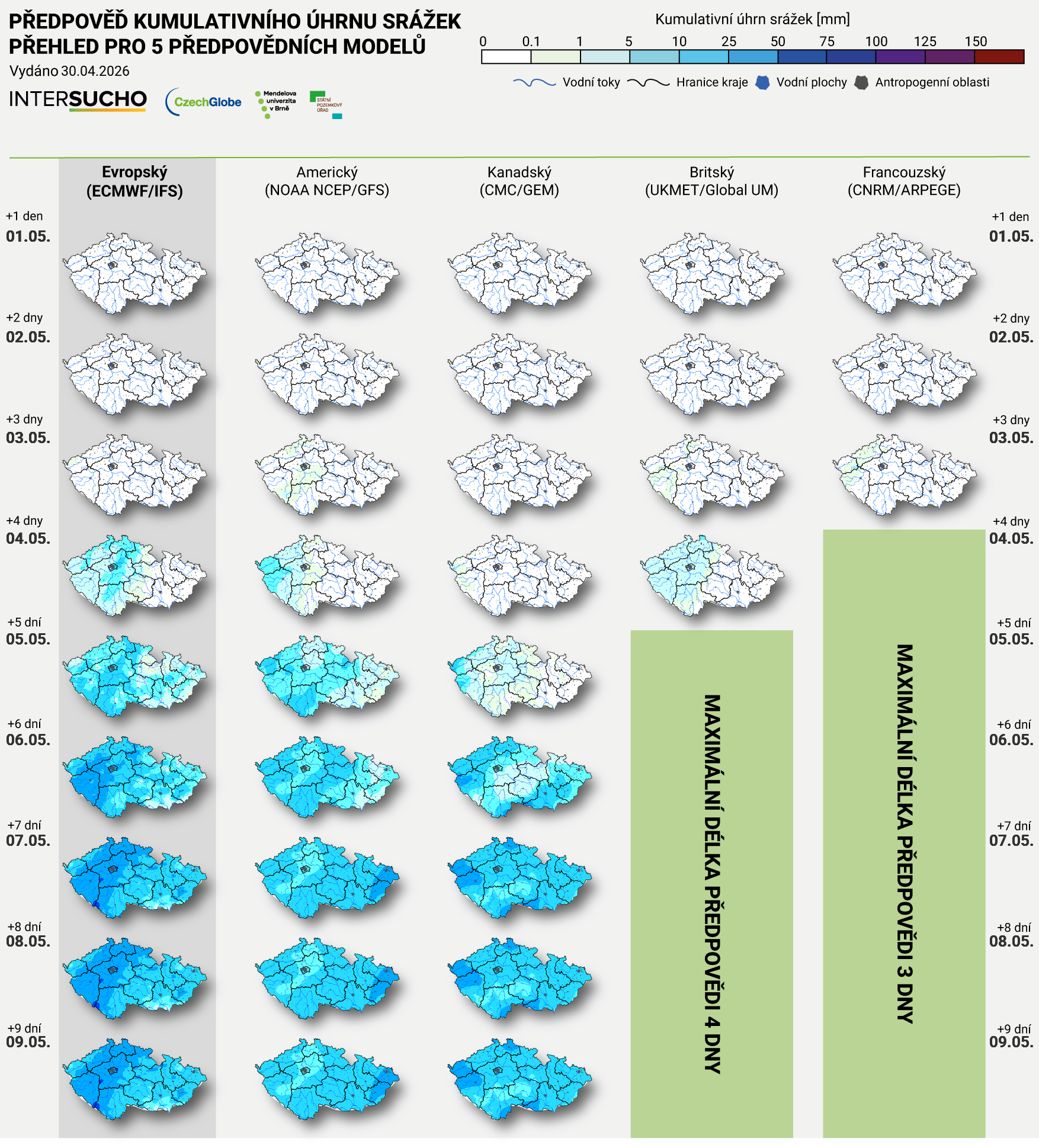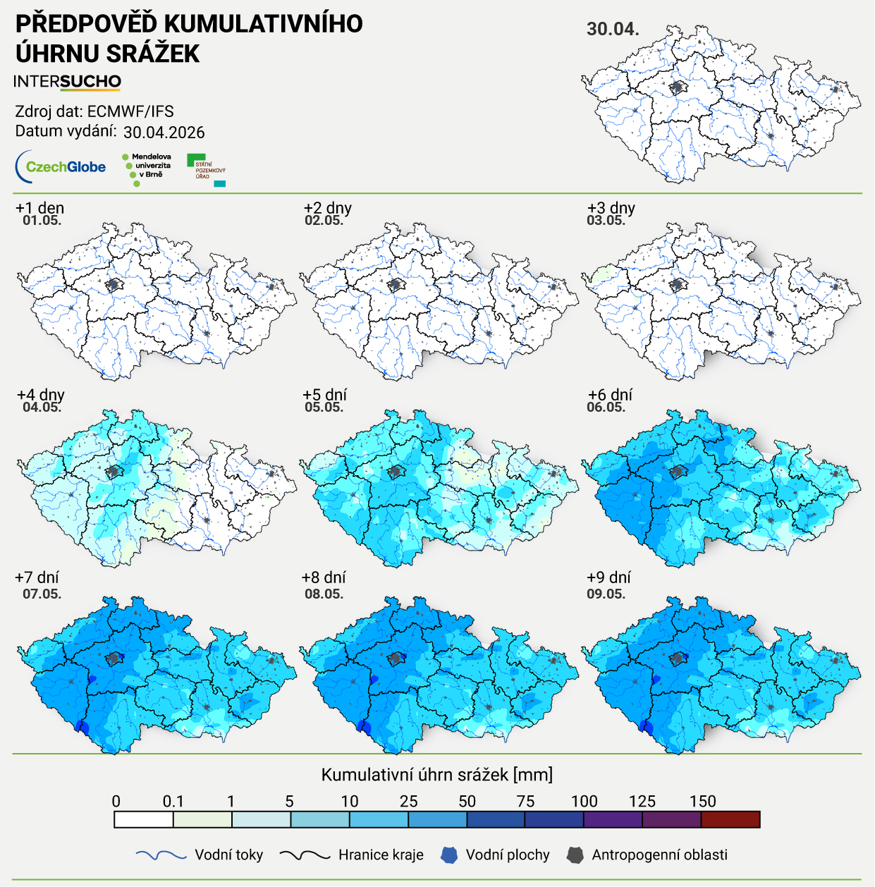 V tomto týdnu (od 27. 4. 2026) bude území Česka hlavně pod vlivem tlakové výše nad Severním mořem, která se začne přesouvat více do střední Evropy. S ohledem na to bude na naše území proudit spíše chladnější vzduch od severu. Bohužel modely tento týden neočekávají žádné srážky. Teploty budou do čtvrtka relativně nižší. Nejchladnějšími dny by měly být středa a čtvrtek s maximy okolo 10–15 °C. Poté se začne oteplovat. O víkendu se mohou teploty vyšplhat i přes 20 °C. Noční teploty se budou často pohybovat mezi 3–6 °C. Ve čtvrtek ráno však mohou klesnout pod bod mrazu. Vzhledem k tomu, že by tento týden nemělo pršet, očekává se, že se půdní sucho bude výrazně rozšiřovat. Ve vrstvě do 40 cm bude na většině území republiky odchylka půdní vlhkosti od obvyklého stavu výrazná až extrémní. Na mnoha místech budou hodnoty relativní půdní vlhkosti už nižší než 30 %. V hlubších vrstvách bude nepříznivá situace nadále hlavně na Českomoravské vrchovině a obecně ve středních a vyšších polohách.